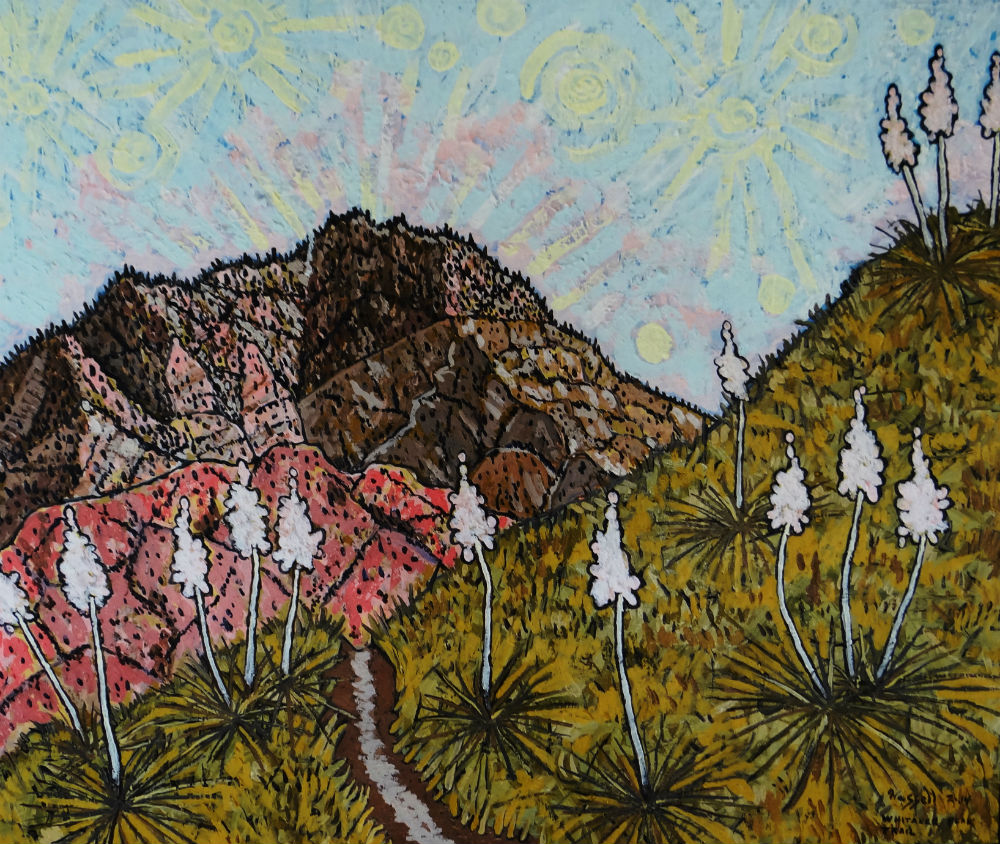 558. Whitaker Peak Trail 2/14 February 16, 2014 by Wassell Art Size 30″ X 25″ Trail is off the Templin Highway exit of the 5 freeway, just south of Pyramid Lake. View shows Cobblestone Mountain from the east, with Sun Dancers!