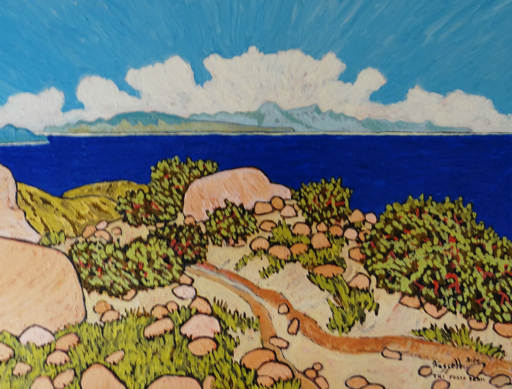 566. Tri Peaks Trail 3/14 March 20, 2014 by Wassell Art 566. Tri Peaks Trail 3/14 Size 27″ X 21″ The view is of Santa Cruz Island from the top of Bony Mountain.